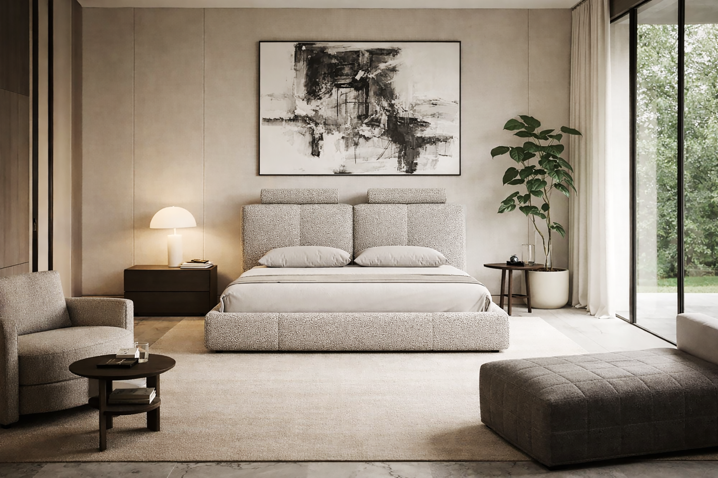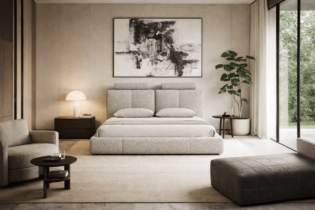 Designed for Moho and launched in 2026. Bold and refined identity through texture and form. Its intention is to reinterpret comfort with a distinctive visual language, where structured upholstery and soft elements coexist to create a bed that feels both inviting and unexpected. The Bond Bed expresses a contemporary, character-driven style. The design balances strong vertical lines with soft, rounded volumes, resulting in a modern aesthetic that feels expressive without being excessive.