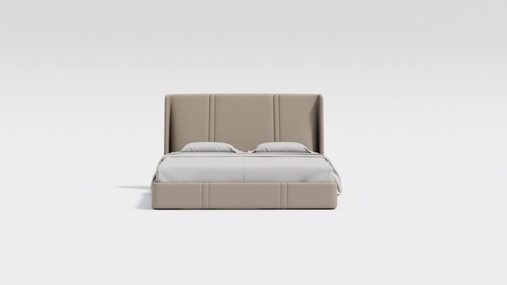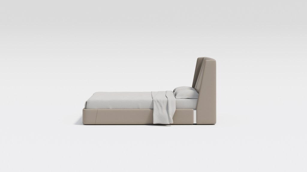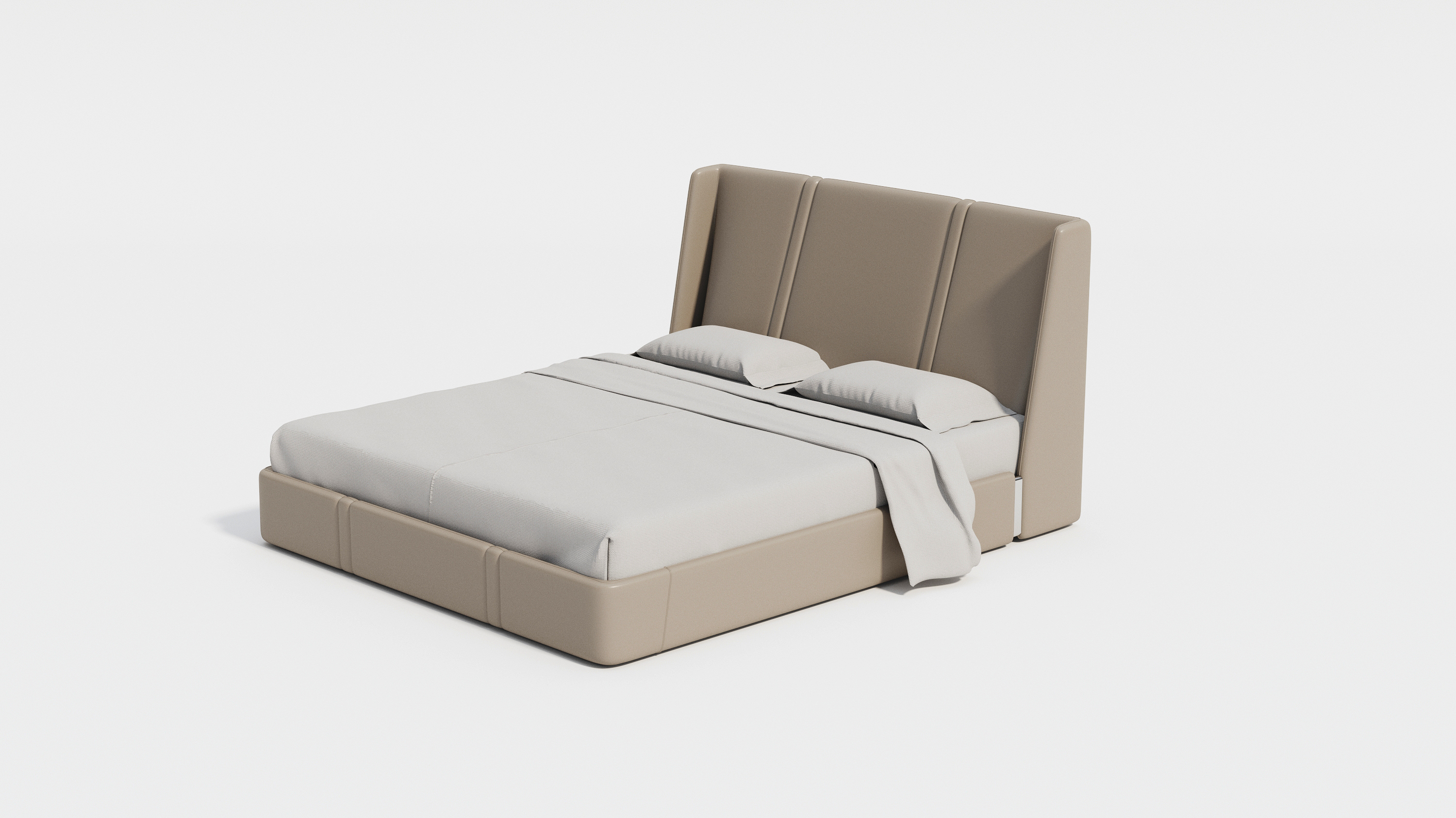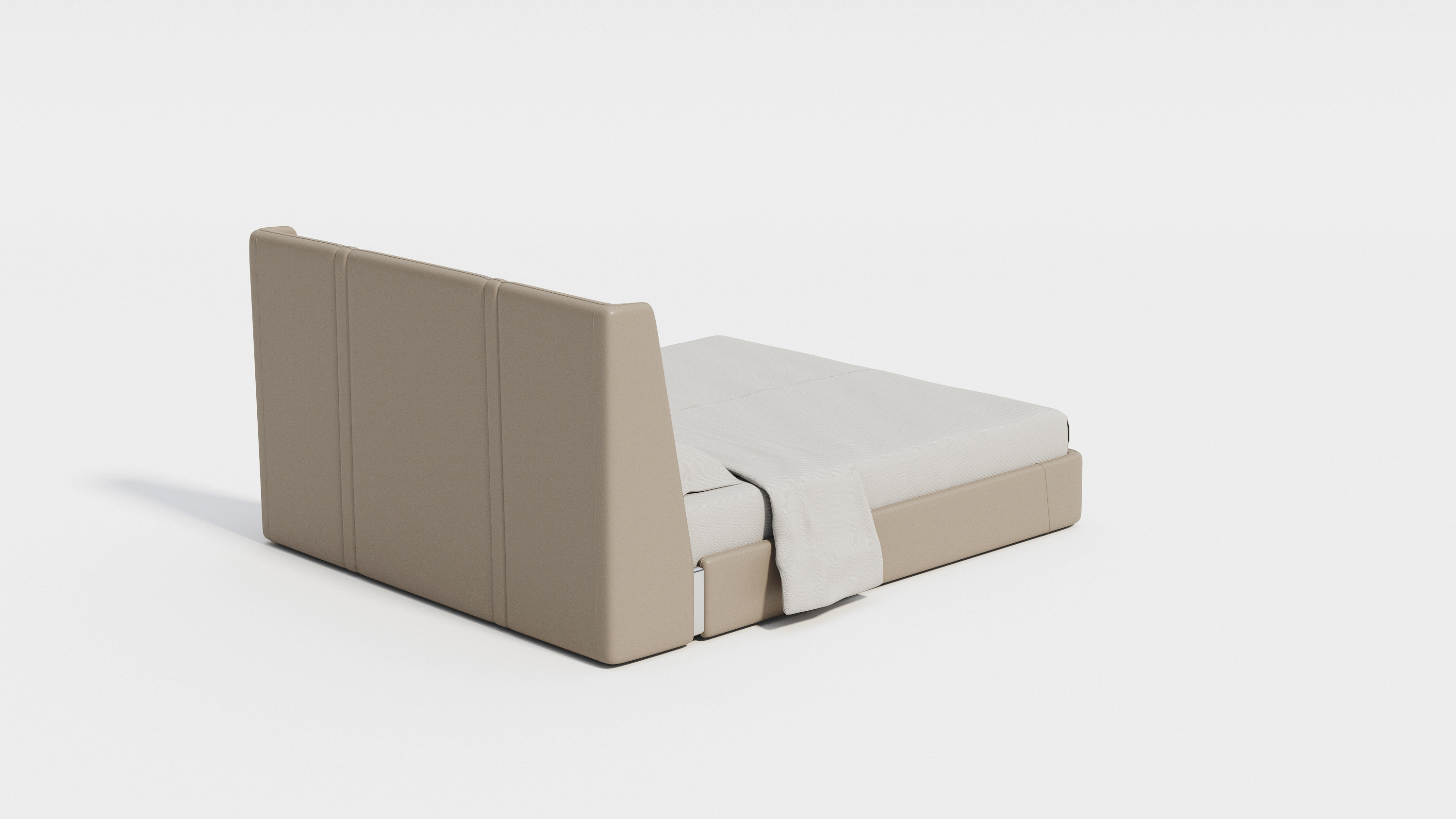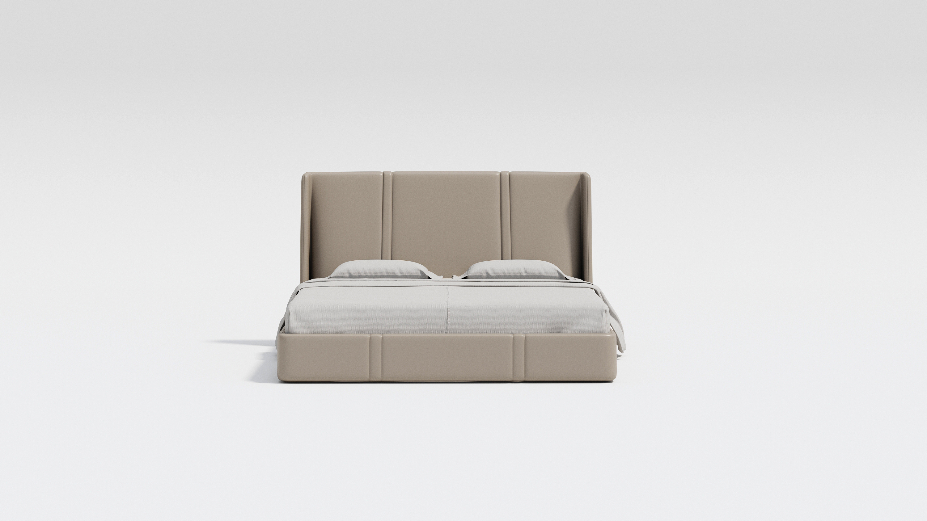 Designed with a focus on balancing architectural presence and everyday comfort in contemporary domestic interiors. The fully upholstered structure gives the bed a soft and welcoming character, while the overall design remains minimal and timeless, avoiding short-lived trends. Key design decisions focus on proportion and details. The tall padded headboard is defined by vertical graphic stitching, adding rhythm and structure. The full base profile keeps the bed visually grounded, while rounded edges reinforce a sense of comfort and safety. Subtle metal side details add a visual accent to the overall composition. Designed to feel welcoming, refined, and practical, offering a considered balance between comfort, material quality, and visual clarity.