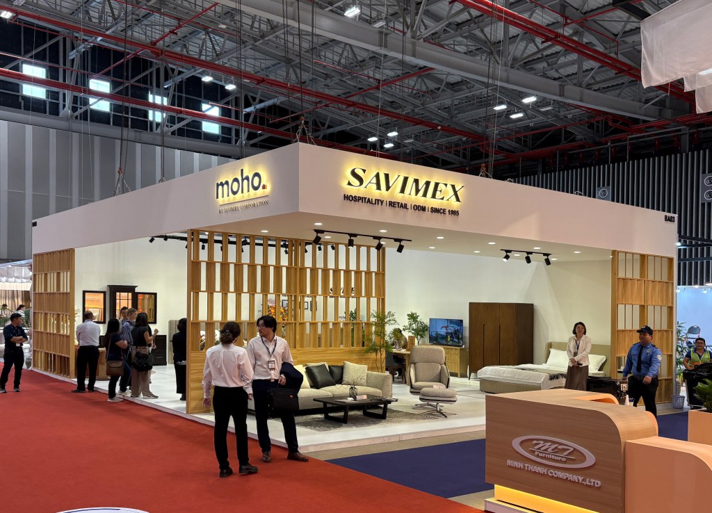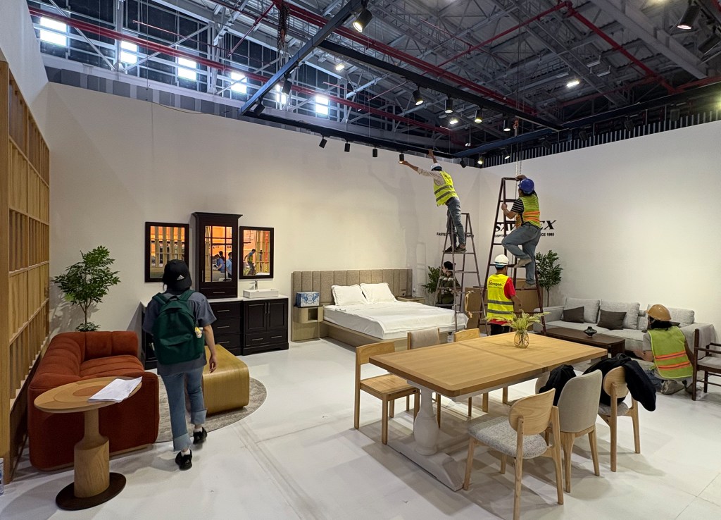 The booth is defined by a clear wooden frame pattern and an open, welcoming layout that maximizes visibility and flow. A suspended white structure creates a strong, recognizable presence from a distance, and the inside is defined by warm wooden partitions subtly organizing the space into product zones without closing it off. Visitors can move naturally through the booth, while each area presents products in a calm but curated setting. The contrast between the clean outer volume and the textured wood elements creates a space that feels contemporary and inviting, allowing the furniture to be the true focal point.