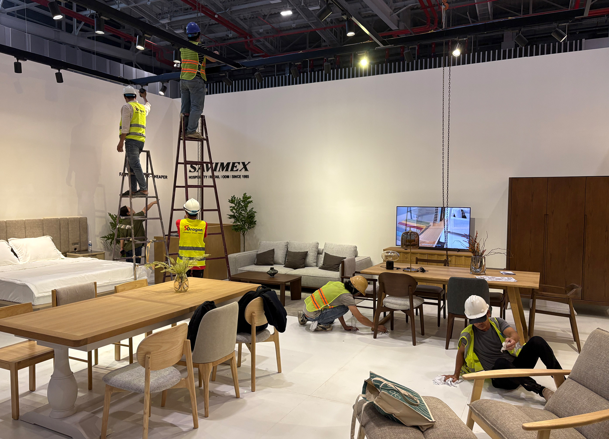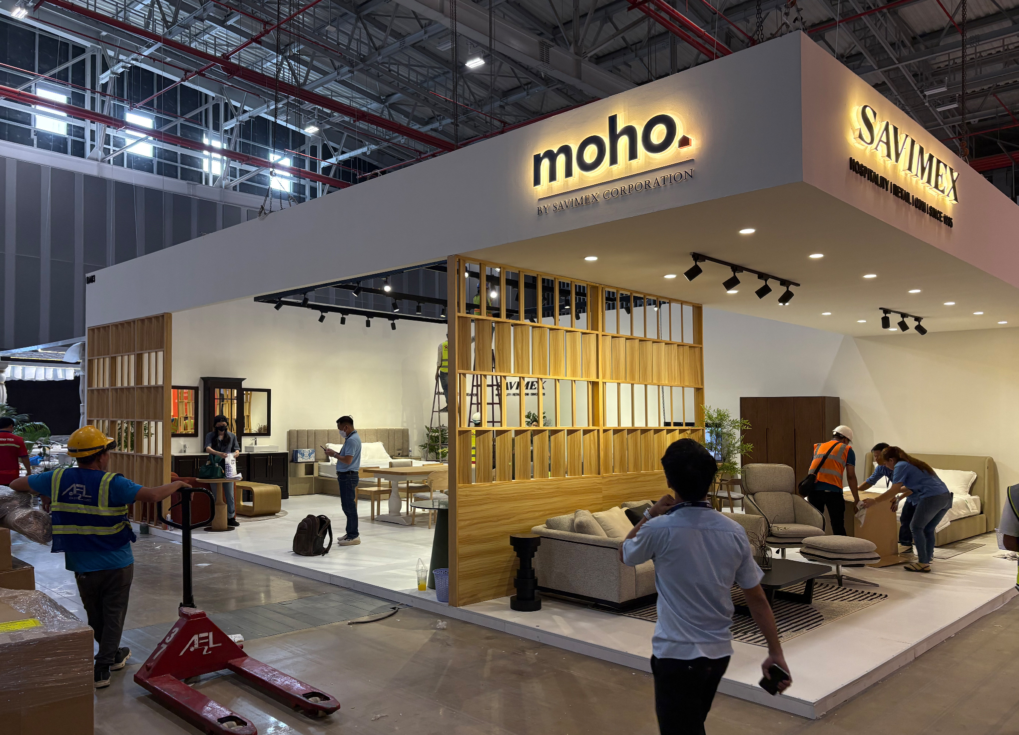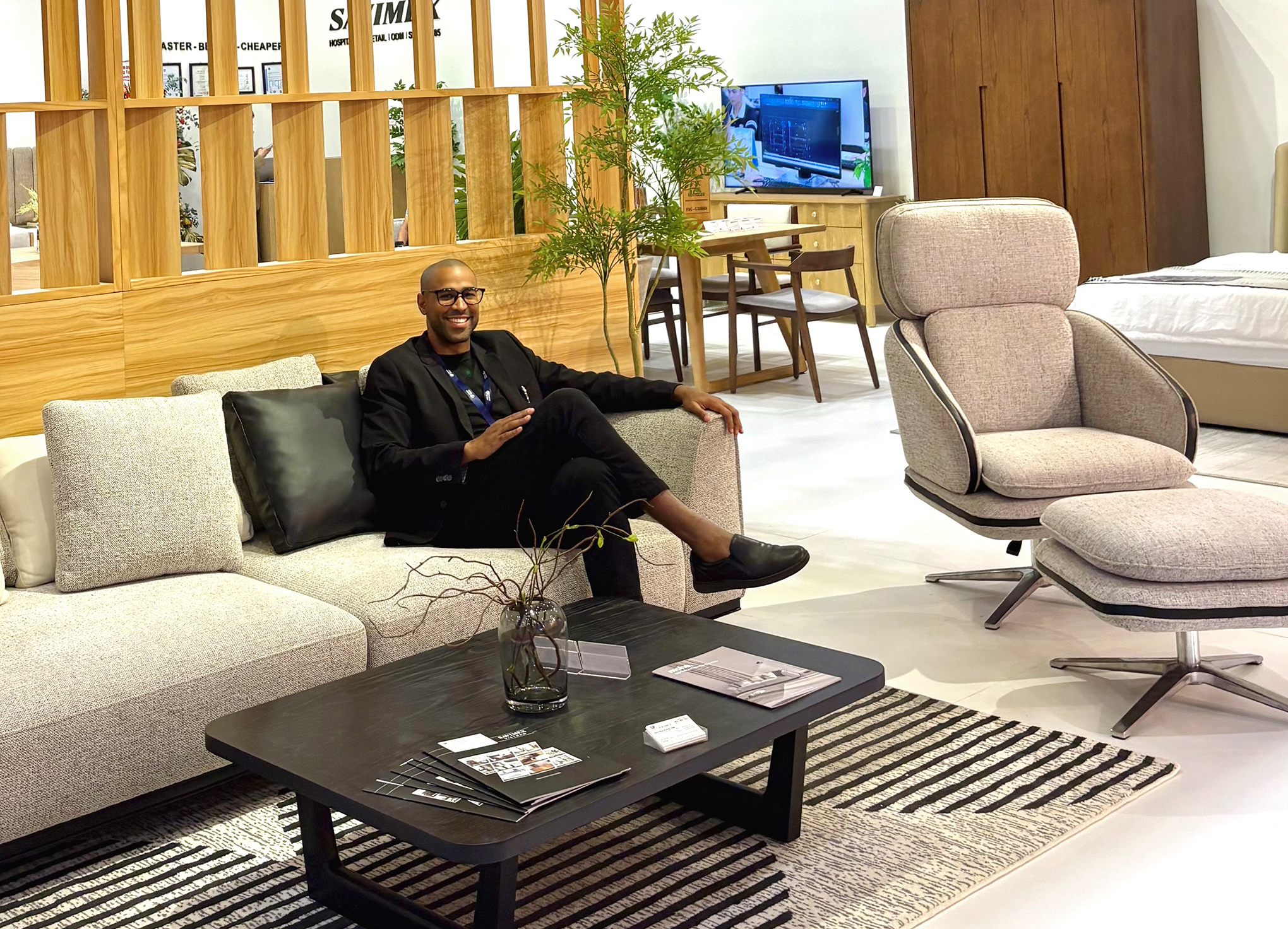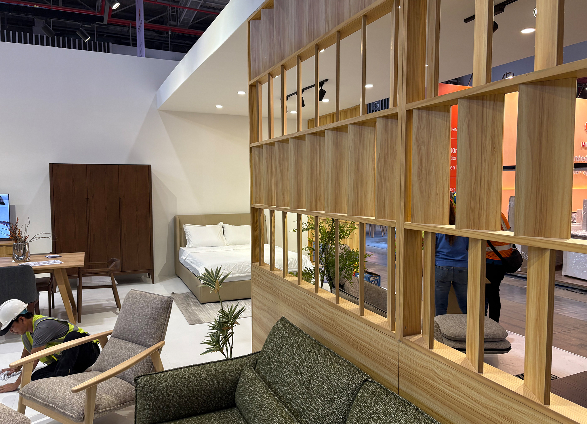 The booth is defined by a clear wooden frame pattern and an open, welcoming layout that maximizes visibility and flow. A suspended white structure creates a strong, recognizable presence from a distance, and the inside is defined by warm wooden partitions subtly organizing the space into product zones without closing it off. Visitors can move naturally through the booth, while each area presents products in a calm but curated setting. The contrast between the clean outer volume and the textured wood elements creates a space that feels contemporary and inviting, allowing the furniture to be the true focal point.